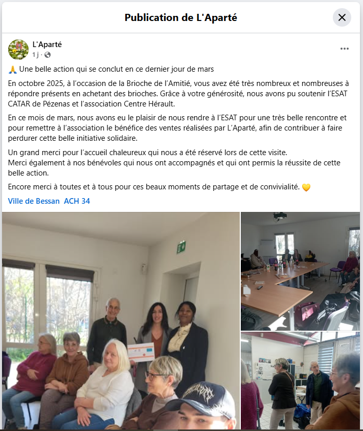 Jeudi 12 mars, nous avons eu le plaisir d’accueillir Mme FABRE, directrice du Centre socio‑culturel l'Aparté du CCAS de Bessan, ainsi que son équipe.